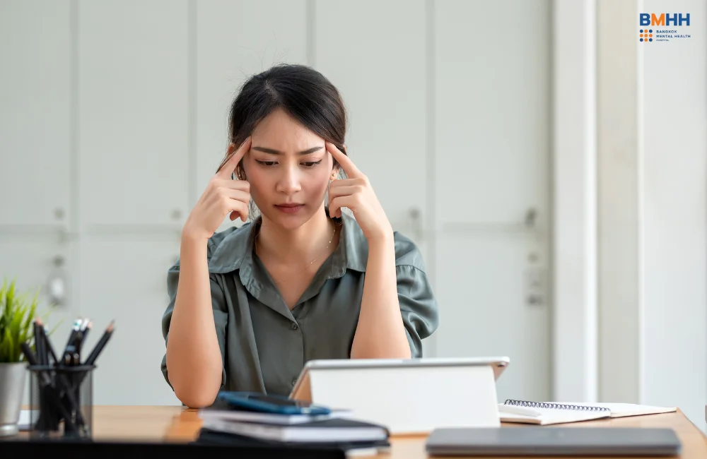 - อาการทางร่างกาย ปวดศีรษะเรื้อรัง ปวดเมื่อยตามร่างกาย หัวใจเต้นเร็วผิดปกติ หายใจลำบาก เหงื่อออกง่าย