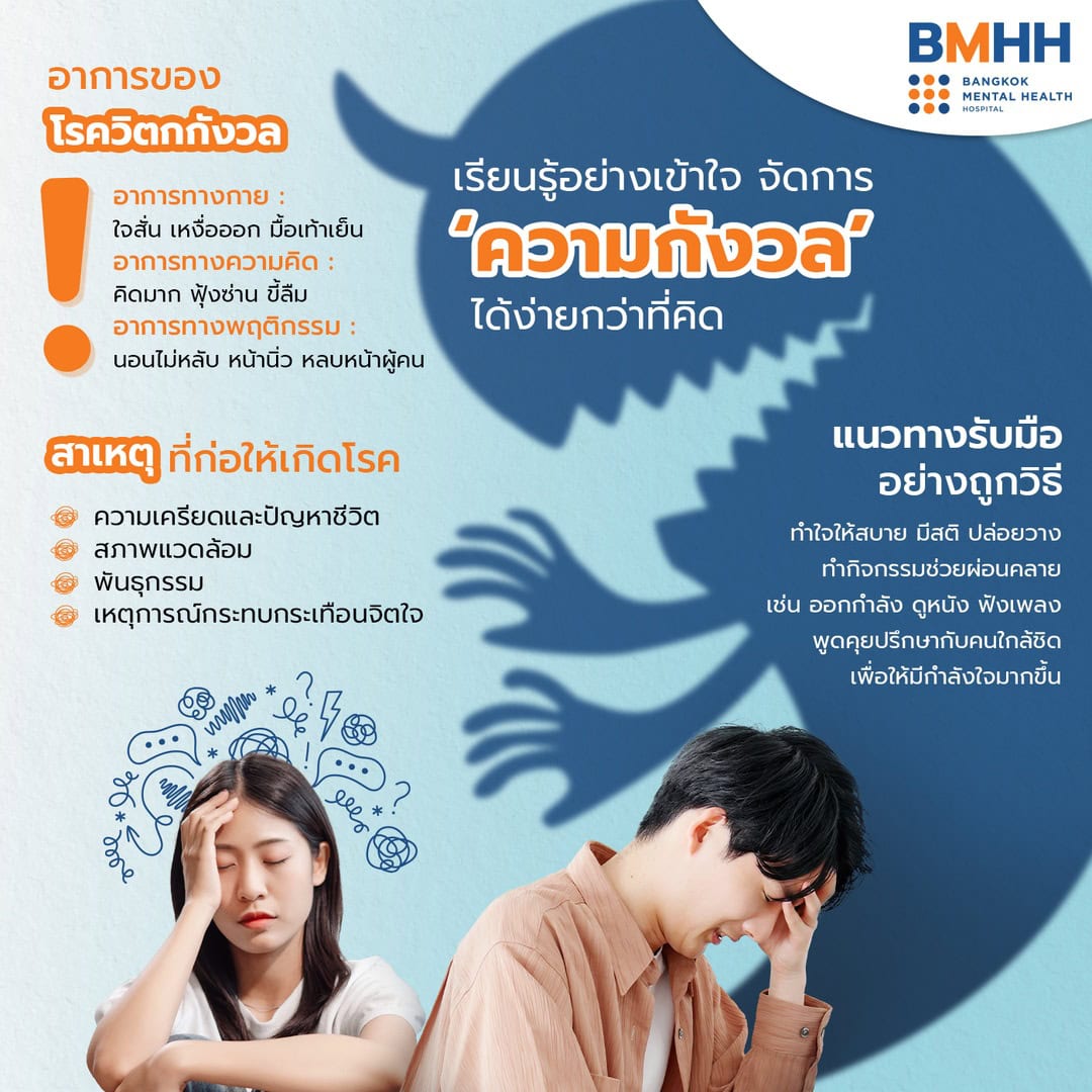 แม้จะขึ้นชื่อว่าเป็นโรคทางจิตเวช แต่ความวิตกกังวลไม่ได้น่ากลัวอย่างที่คิดและเป็นสิ่งที่รับมือได้ เพียงแค่เรารู้ เข้าใจ และดูแลตัวเองอย่างถูกวิธี หากต้องการคำปรึกษาเพื่อดูแลจิตใจให้กลับมาใช้ชีวิตได้อย่างมีความสุขอีกครั้ง สามารถพูดคุยหรือขอความช่วยเหลือจากจิตแพทย์หรือนักจิตวิทยาได้ที่โรงพยาบาลแบงค็อก เมนทัล เฮลท์ โรงพยาบาลจิตเวชเฉพาะทางในเครือของโรงพยาบาลเวชธานี เรายินดีดูแลคุณอย่างใกล้ชิด เพื่อให้ก้าวผ่านช่วงเวลาแห่งความไม่สุขสบายได้อย่างราบรื่น